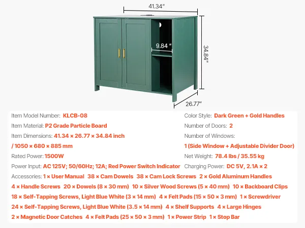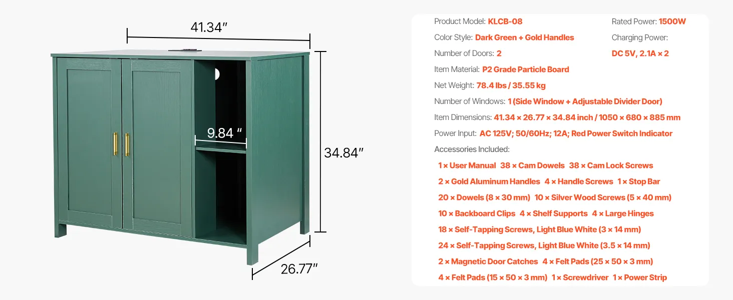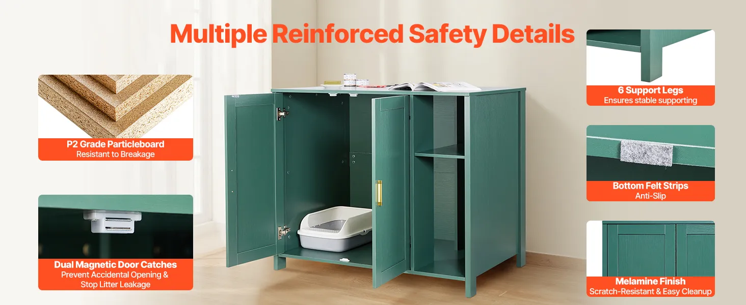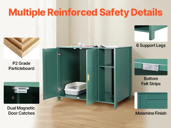 Wykonana z bezpiecznych i trwałych paneli pokrytych melaminą P2, metalowych zatrzasków, uchwytów ze stopu aluminium, antypoślizgowych podkładek filcowych i magnetycznych drzwiczek. Ukryta obudowa kuwety z sześcioma nogami zapewnia stabilne i nie chwiejące się podparcie, nawet gdy kot drapie.