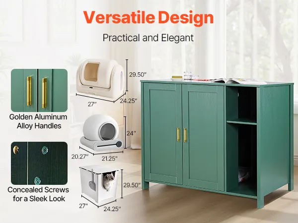 Solidna i trwała konstrukcja: Wykonana z płyty wiórowej klasy P2 z sześcioma solidnymi nogami podporowymi, ta ukryta szafka na kuwetę dla robota wytrzymuje obciążenie do 40 kg (88 funtów) na górze i 45 kg (93 funty) na dole. Powłoka melaminowa jest odporna na wodę i zarysowania, wytrzymuje codzienne zużycie i zadrapania kota, a także pozostaje stabilna nawet po podskakiwaniu.