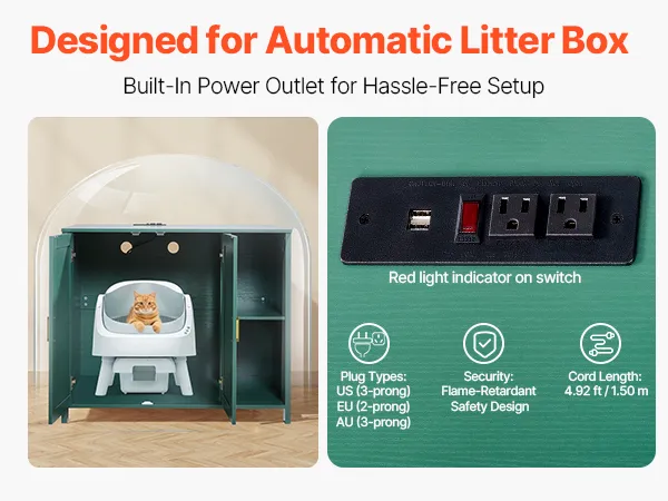 Nasza automatyczna obudowa kuwety jest wyposażona w trzybolcowe gniazdo kompatybilne z wtyczkami EU. Posiada zabezpieczenie ognioodporne i czerwony włącznik zasilania dla bezpiecznego i wygodnego użytkowania.