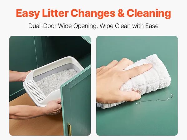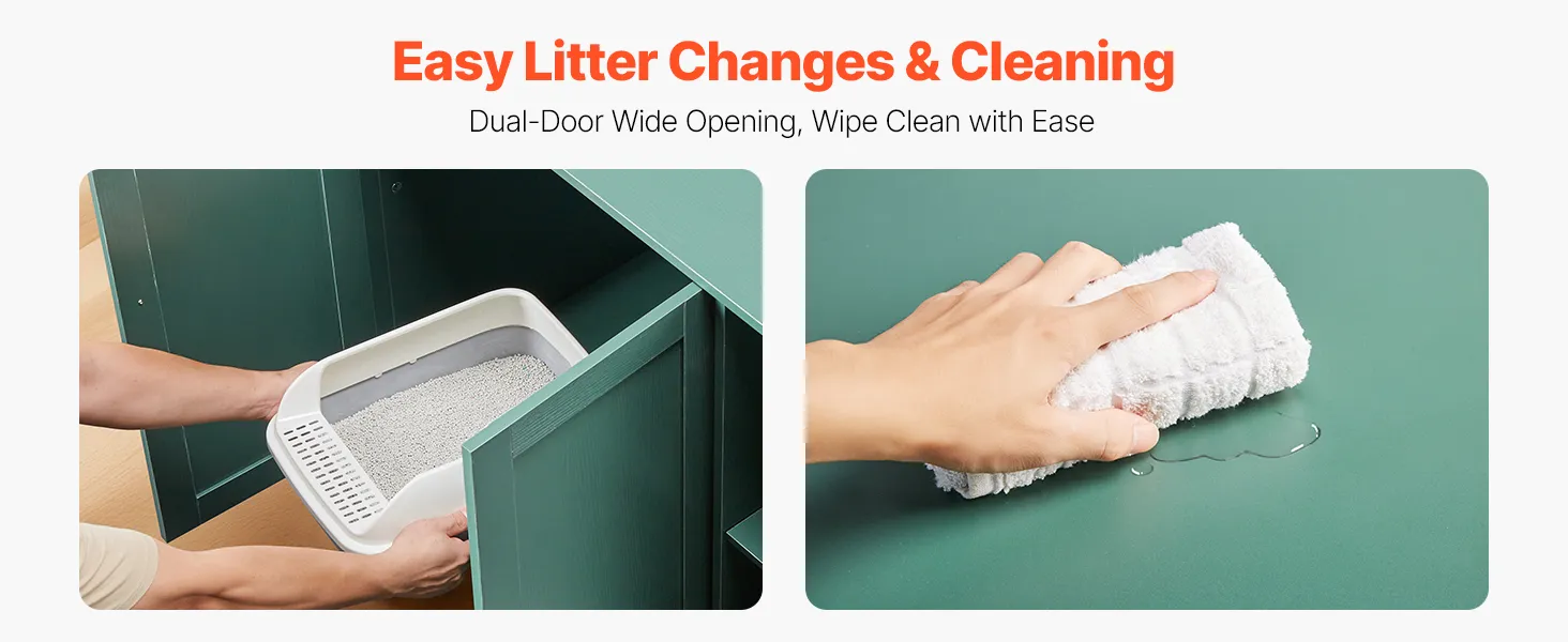 Drewniana obudowa kuwety posiada dwoje szeroko otwieranych przednich drzwiczek, które ułatwiają wyjmowanie kuwety. Wodoodporną, odporną na mocz powierzchnię można łatwo wyczyścić, oszczędzając czas i wysiłek.