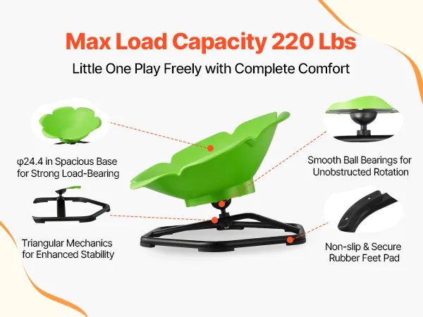 Obrotowy fotel dziecięcy z poszerzoną metalową podstawą (φ 62 cm) udźwignie do 100 kg. Jego trójkątna konstrukcja z łożyskami kulkowymi zapewnia płynny obrót, a antypoślizgowa powierzchnia zapobiega przesuwaniu się podczas zabawy.