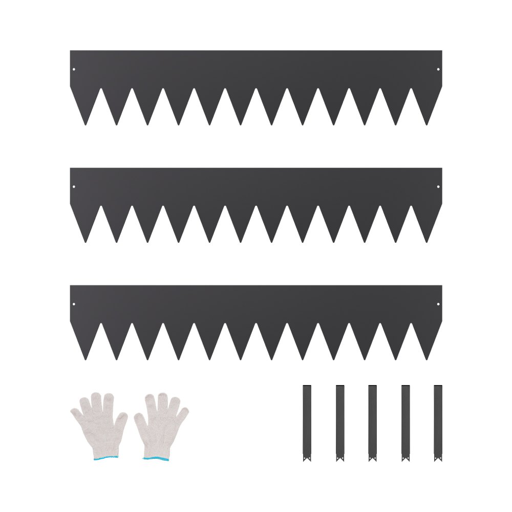 W zestawie: Każdy zestaw zawiera 3 metalowe listwy obrzeżowe, 1 parę rękawic montażowych, 5 klipsów i 1 instrukcję obsługi. Wydłużony kolczasty kształt zapewnia łatwy montaż, ponieważ bariera wnika w glebę z mniejszym wysiłkiem. Ciesz się ogrodem dłużej, a mniej poświęcaj na jego pielęgnację!