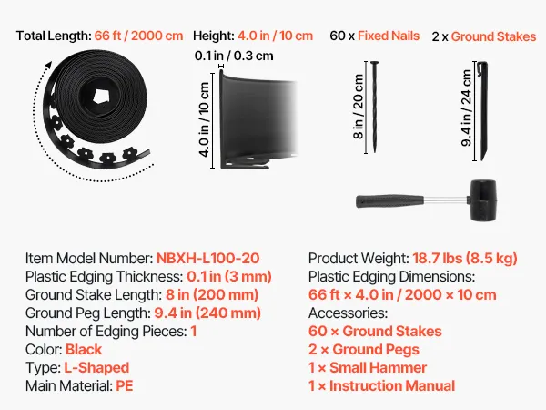 Obrzeże trawnikowe VEVOR, 20 m x 10 cm, plastikowa obwódka ogrodowa z 60 kolcami i 2 kolcami do wbijania w ziemię, obrzeże rabat, obrzeże ogrodowe, obwódka rabat, obrzeża do klombów i chodników ogrodowych