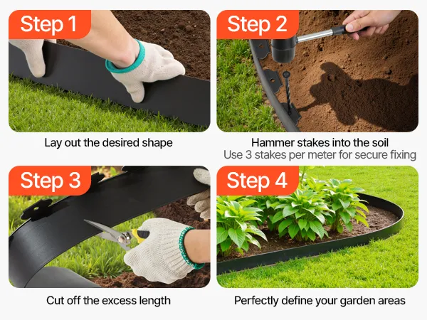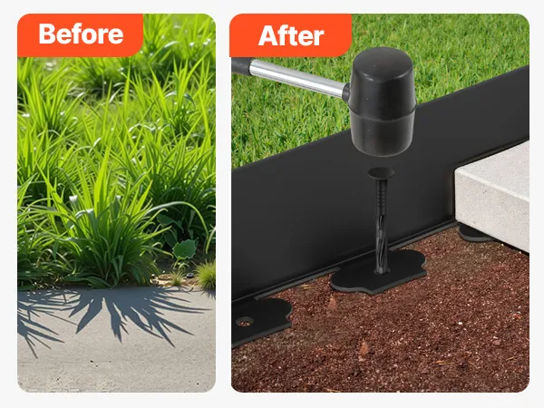 Łatwy montaż: Ułóż obrzeże trawnika wzdłuż krawędzi ogrodu i wbij dołączone gwoździe w otwory. Kolce do wbijania w ziemię wzmacniają połączenia, zapewniając trwałą stabilność – bez konieczności kopania i betonowania.