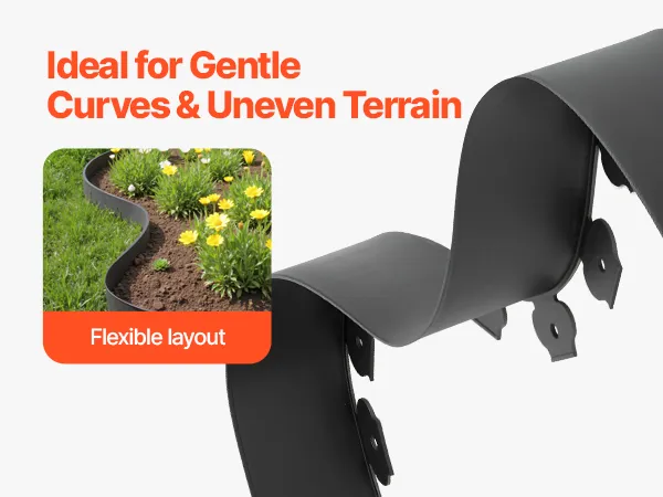 Ta elastyczna obrzeże trawnikowe idealnie nadaje się do ogrodów, rabat kwiatowych, trawników, słojów drzew i ścieżek. Tworzy wyraźne, zdefiniowane granice i schludny wygląd. Wykonane z elastycznego, przycinanego materiału, zawiera paliki do wbijania w ziemię, co ułatwia montaż. Odporne na warunki atmosferyczne, zapewnia trwałość.