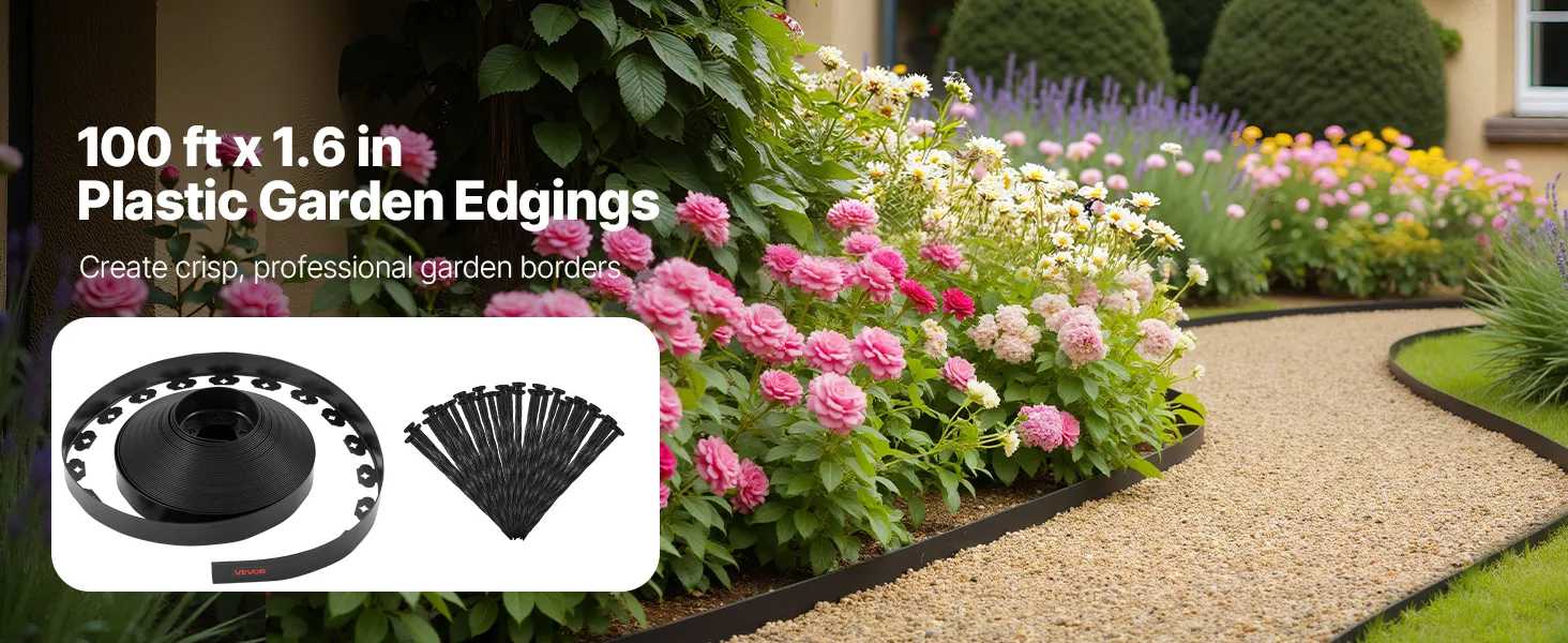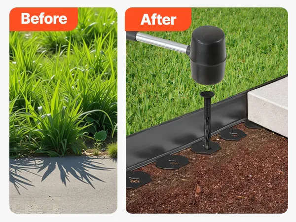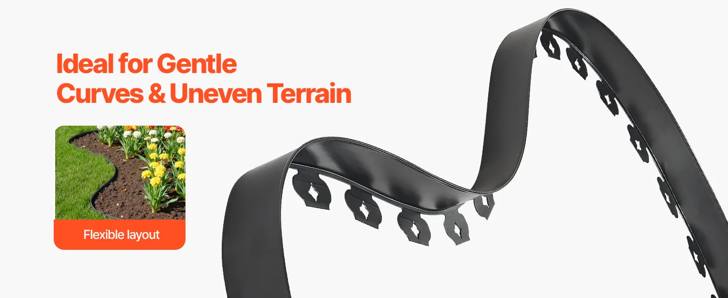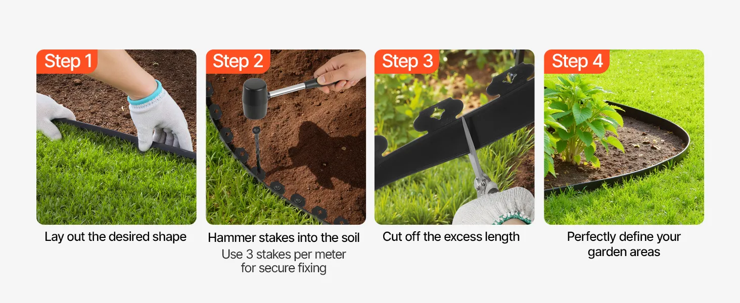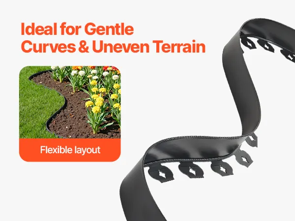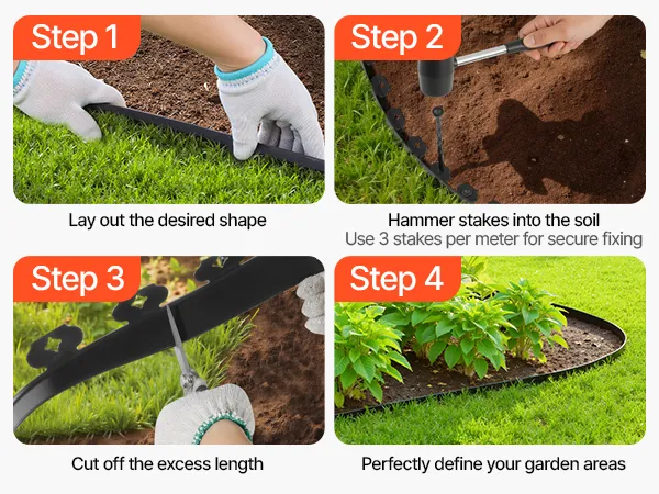 Elastyczne do zakrętów i konturów: Nasze obrzeża ogrodowe można prostować lub wyginać, aby dopasować je do zakrzywionych rabat kwiatowych, słojów drzew lub nierównego terenu. Można je łatwo przyciąć na dowolną długość, aby dostosować je do indywidualnych potrzeb.