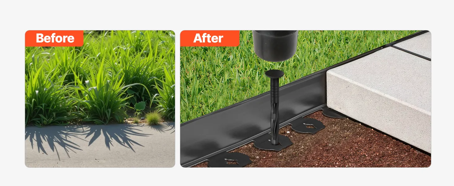 Łatwy montaż: wystarczy umieścić obrzeże trawnika wzdłuż krawędzi i wbić dołączone gwoździe w otwory – nie ma potrzeby kopania ani betonowania.
