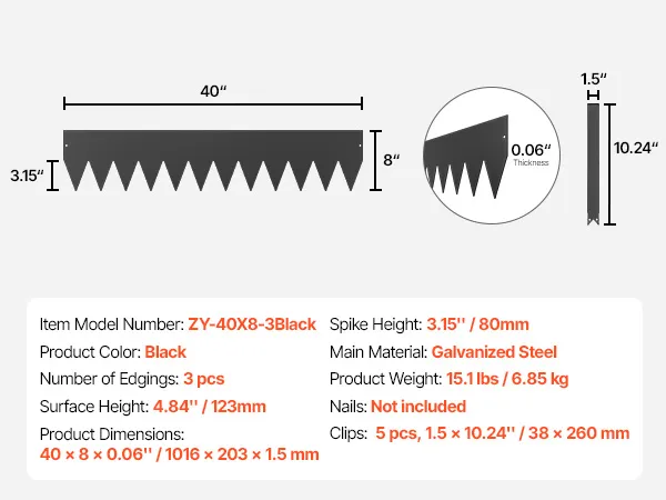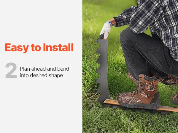 W zestawie: Każdy zestaw zawiera 3 metalowe listwy obrzeżowe, 1 parę rękawic montażowych, 5 klipsów i 1 instrukcję obsługi. Wydłużony kolczasty kształt zapewnia łatwy montaż, ponieważ bariera wnika w glebę z mniejszym wysiłkiem. Ciesz się ogrodem dłużej, a mniej poświęcaj na jego pielęgnację!