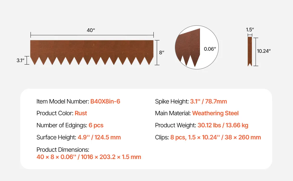 Co otrzymasz: Zestaw zawiera 6 metalowych obrzeży ogrodowych, 1 parę rękawic montażowych, 8 klipsów i 1 instrukcję obsługi. Wydłużona konstrukcja kolca ułatwia wbijanie części w ziemię i zmniejsza wysiłek związany z montażem. Ciesz się większą ilością czasu spędzanego na świeżym powietrzu i oszczędzaj czas przeznaczany na konserwację!