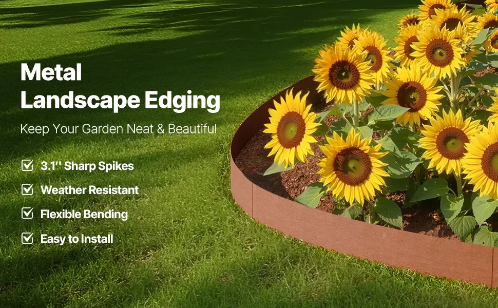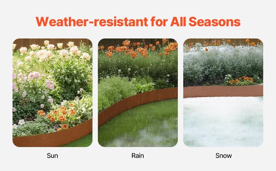 Odporne na warunki atmosferyczne i rdzę: obrzeże trawnikowe wykonane jest z odpornej na warunki atmosferyczne stali, a jego krawędzie są wstępnie zardzewiałe. Z biegiem czasu rdza pogłębia się i tworzy warstwę ochronną, która zwiększa odporność na korozję i zapobiega pękaniu. Gdy rdza już całkowicie utworzy się, można nałożyć warstwę farby poliuretanowej, aby utrwalić farbę i przedłużyć jej żywotność.