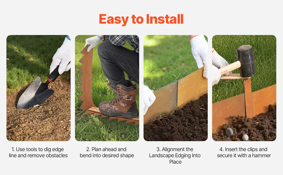 Łatwy montaż: Montaż metalowego obrzeża ogrodowego jest szybki i łatwy. Wystarczy połączyć części za pomocą dołączonych elementów złącznych. Dzięki temu oszczędzasz czas i wysiłek podczas instalacji. (Uwaga: Podczas montażu należy nosić rękawice.)