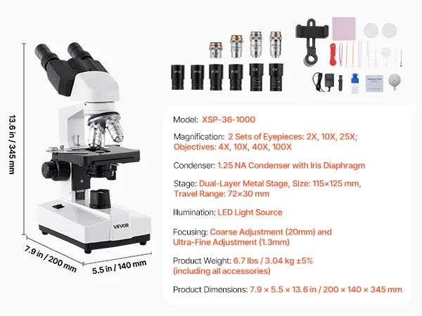Mikroskop binokularowy VEVOR dla dorosłych, profesjonalny zestaw mikroskopowy z powiększeniem 40-5000x, mikroskopem dwustopniowym i 2 zestawami okularów, mikroskopem złożonym z oświetleniem LED i uchwytem na telefon
