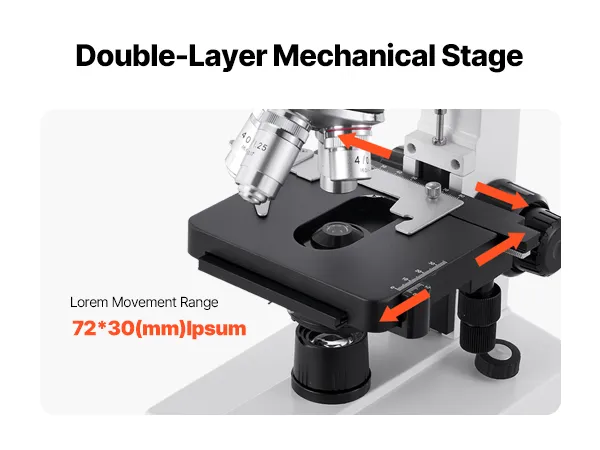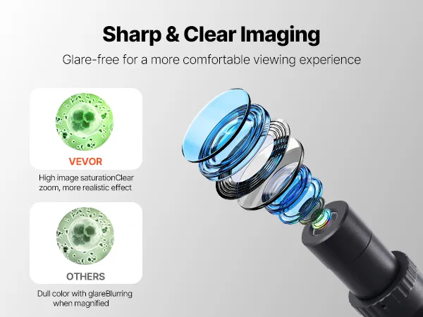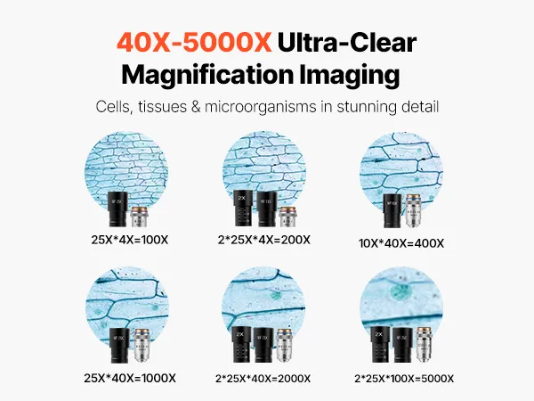 Niezwykle wyraźny obraz powiększenia: wyposażony w okulary WF10X i WF25X oraz obiektywy 4X/10X/40X, ten mikroskop oferuje zakres powiększenia od 40X do 5000X, dzięki czemu idealnie nadaje się do obserwacji struktur komórkowych, próbek tkanek i innych badań naukowych