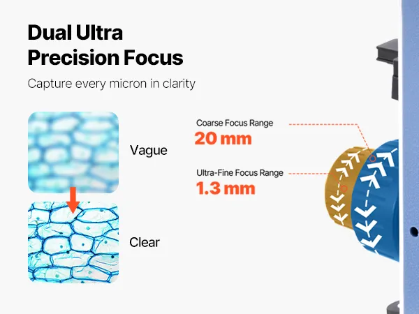 Wyposażony w 20 mm zgrubną regulację ostrości i 1,3 mm precyzyjną regulację ostrości, a także w źródło światła LED i kondensator, mikroskop ten rejestruje każdy mikronowy szczegół i dostarcza niezwykle wyraźne obrazy.