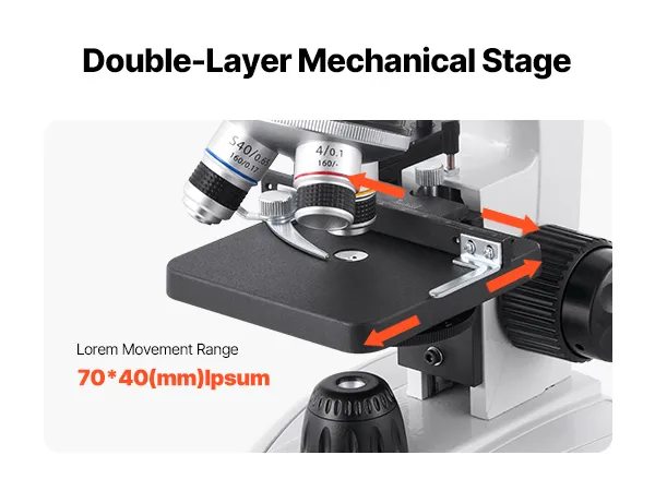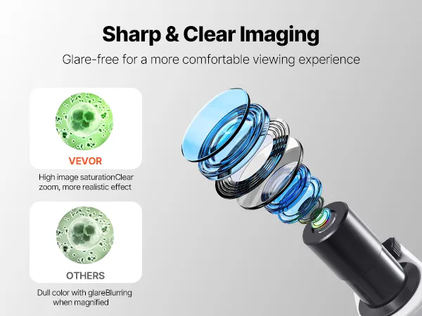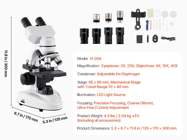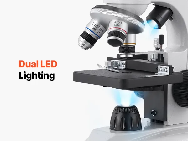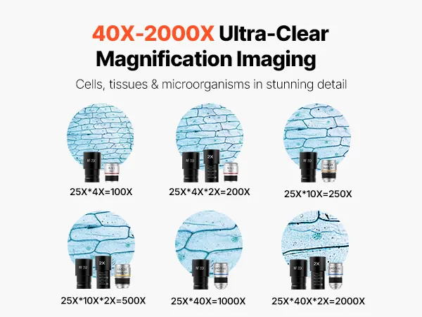 Ultrawyraźny obraz powiększenia: wyposażony w okulary WF10X i WF25X oraz obiektywy 4X/10X/40X, ten mikroskop oferuje zakres powiększenia od 40X do 2000X, dzięki czemu idealnie nadaje się do obserwacji struktur komórkowych, próbek tkanek i innych badań naukowych
