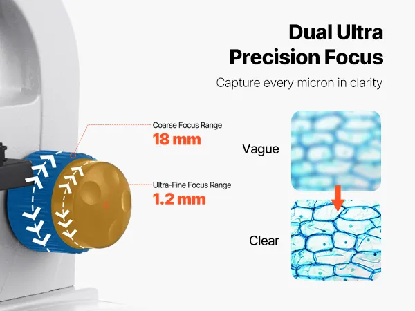 Bezproblemowe i szybkie ustawianie ostrości: 15-milimetrowy zgrubny mechanizm regulacji ostrości oraz podwójna współosiowa regulacja zgrubna i precyzyjna zapewniają płynne przejście od rozmycia do ostrości. Dzięki zgrubnemu mechanizmowi regulacji ostrości (18 mm) i precyzyjnemu mechanizmowi regulacji ostrości (1,2 mm) regulacja ostrości jest płynniejsza i bardziej precyzyjna, zapewniając stabilny obraz podczas oglądania preparatów lub struktur mikroskopowych. Konstrukcja ta spełnia wymagania dotyczące obserwacji różnorodnych materiałów.