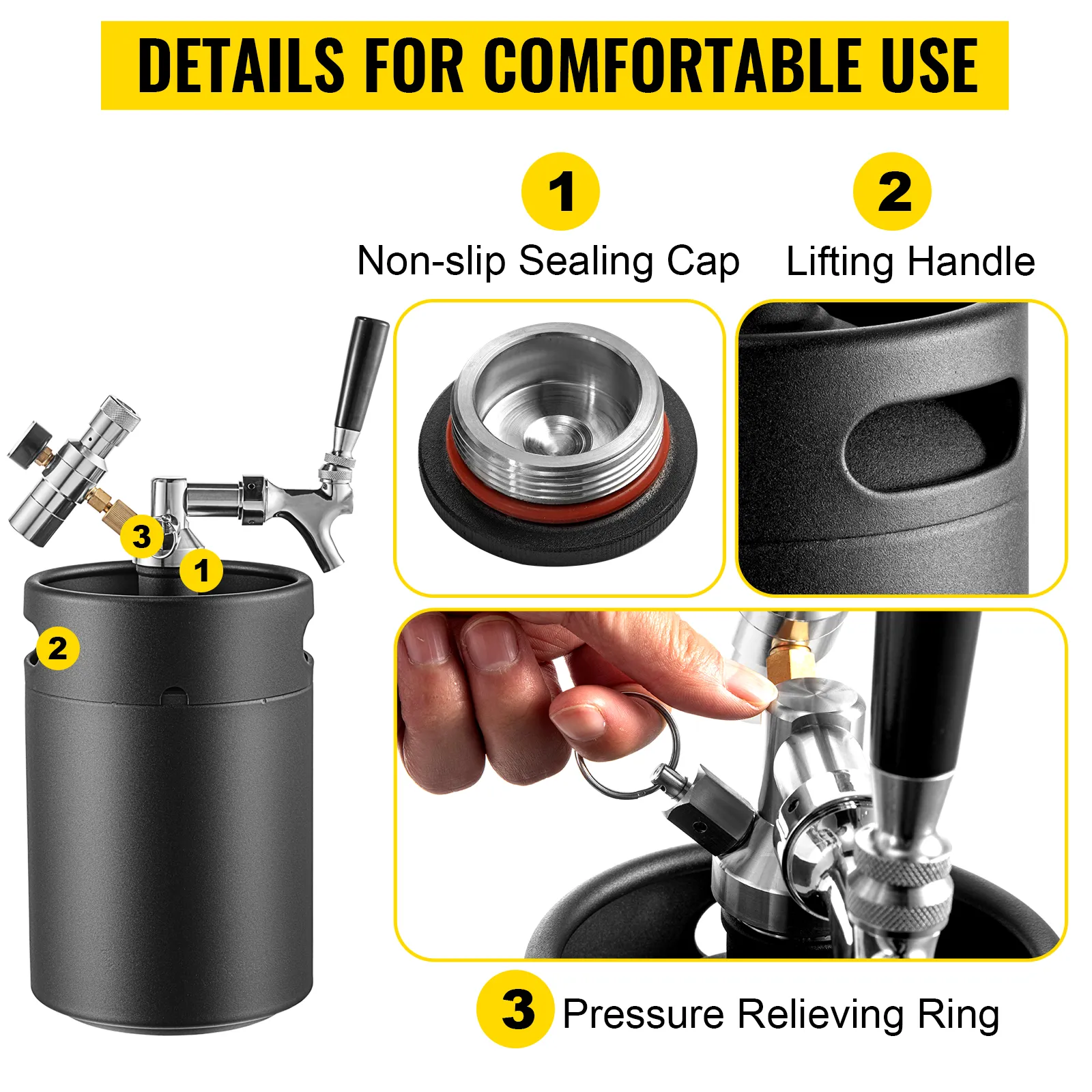 Dostępna jest gwintowana i szczelna zakrętka, która zapewnia niezawodne uszczelnienie i jest łatwa do uchwycenia, dzięki czemu Twój system dozowania beczek staje się uniwersalną puszką na napoje. Dwa puste rowki po obu stronach ułatwiają przenoszenie. Możesz także wyciągnąć pierścień nadmiarowy ciśnienia na kilka sekund, aby zredukować pianę w środku przed nalaniem piwa.