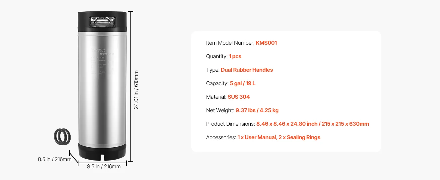 VEVOR Corny Keg Ball Lock Keg 19 L, beczka ze stali SUS304 do zimnego parzenia z dwoma gumowymi uchwytami i wytrzymałym gumowym dnem, sprzęt do domowego warzenia piwa, na imprezy, do baru, bistro, restauracji, kawiarni, 1 opakowanie.
