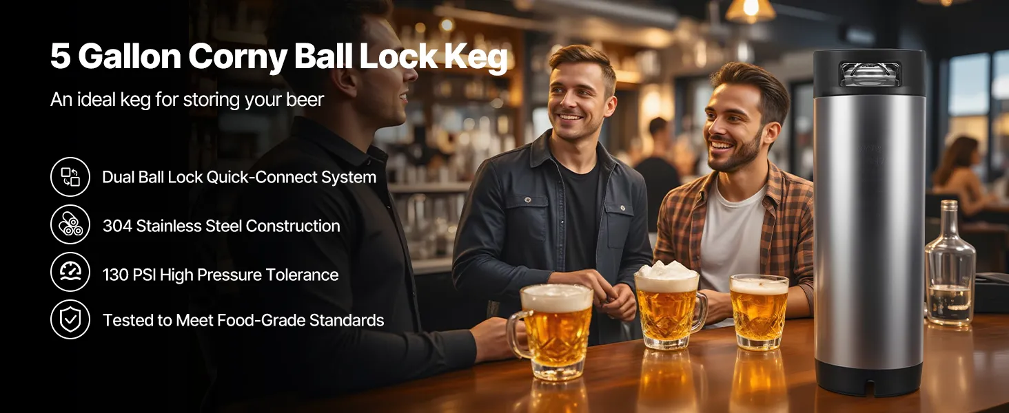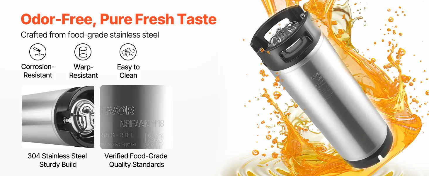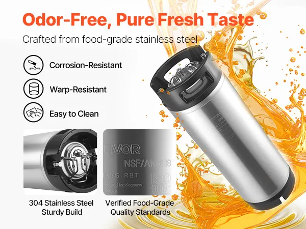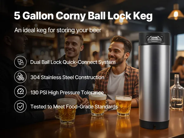 Wysokiej jakości materiały: 5-galonowa (19 l) beczka Corny Ball Lock, wykonana ze stali nierdzewnej 304 dopuszczonej do kontaktu z żywnością, oferuje napoje o czystym smaku, charakteryzujące się wysoką odpornością na korozję i ciśnienie. Jest wystarczająco trwała, aby służyć przez długi czas i zachowuje swój kształt i jakość nawet przy wielokrotnym parzeniu lub serwowaniu.