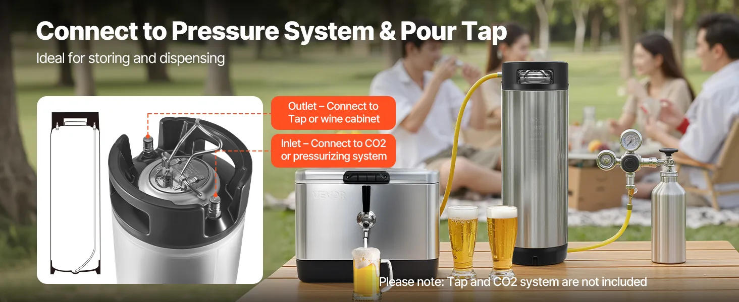 Wyposażony w dwa szybkozłącza z blokadami kulowymi, ten keg do domowego warzenia piwa można łatwo połączyć ze zbiornikami CO₂ i systemami dozowania. Gaz na wejściu, piwo na wyjściu – wystarczy podłączyć i rozpocząć nalewanie. Praktyczny wybór dla piwowarów domowych, którzy chcą zoptymalizować narastanie ciśnienia i dozowanie.