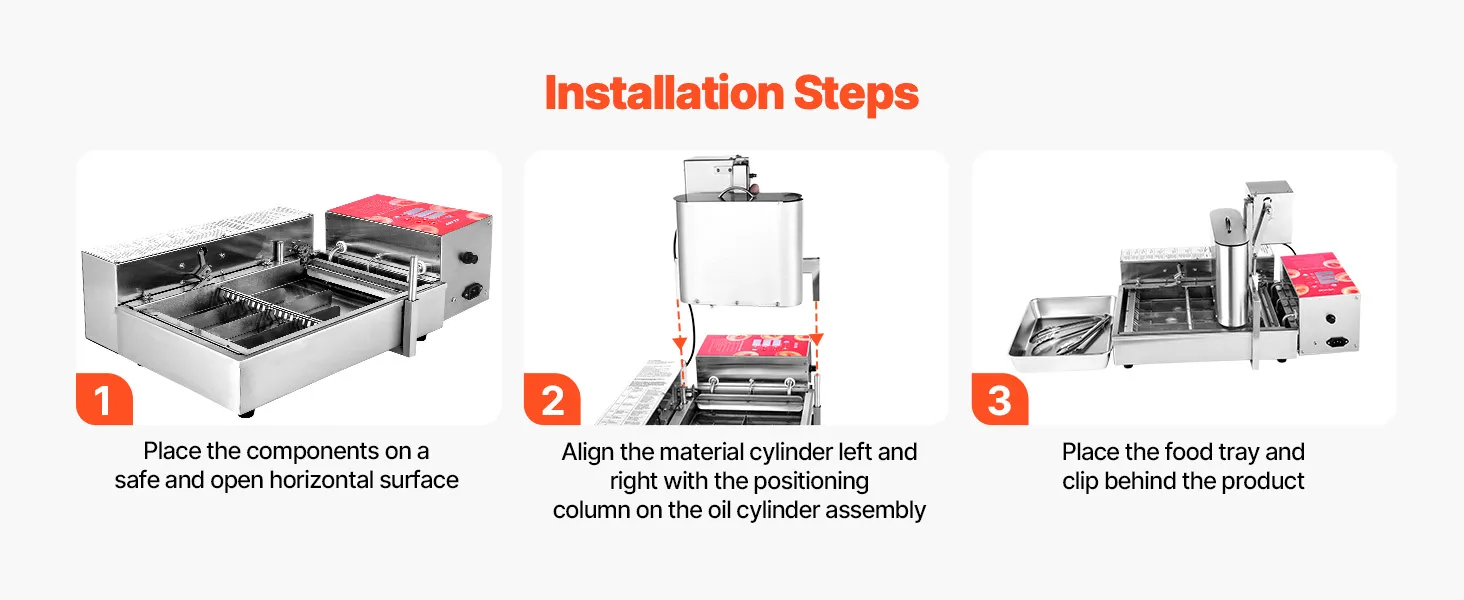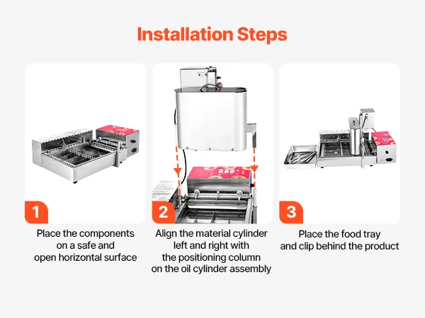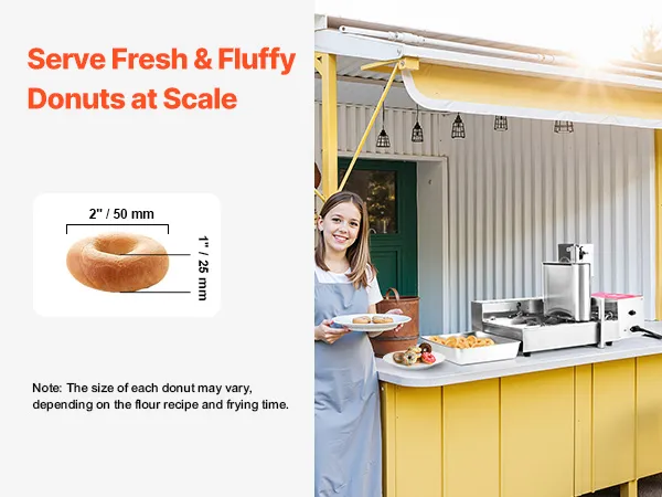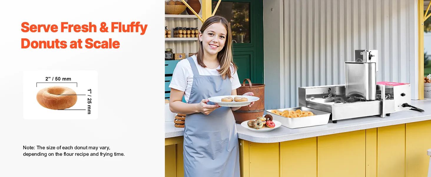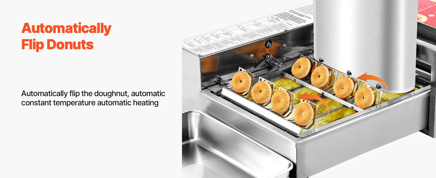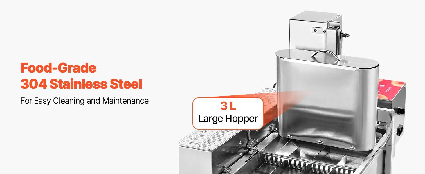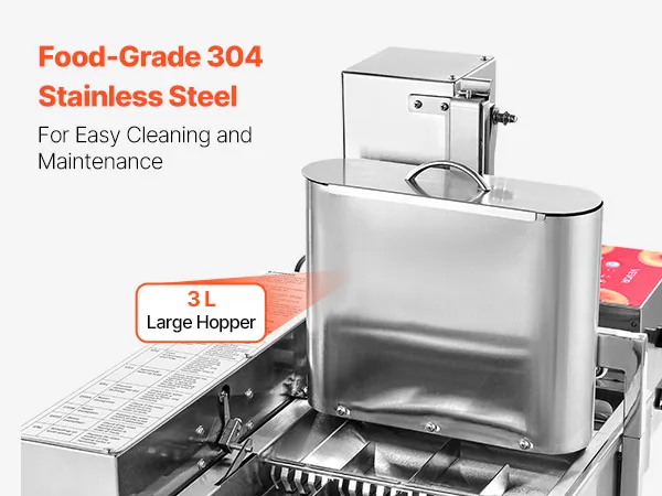Stal nierdzewna dopuszczona do kontaktu z żywnością: Ta frytkownica do pączków wykonana jest ze stali nierdzewnej 304, co ułatwia czyszczenie i konserwację. Dzięki 3-litrowemu zasobnikowi i 6,1-litrowemu zbiornikowi na olej, urządzenie jest przeznaczone do produkcji wielkoseryjnej bez konieczności ciągłego uzupełniania.