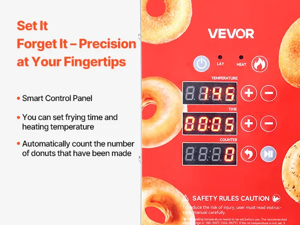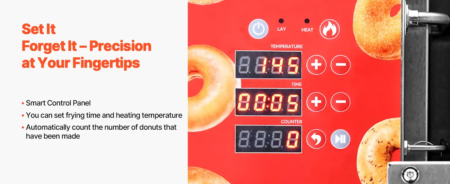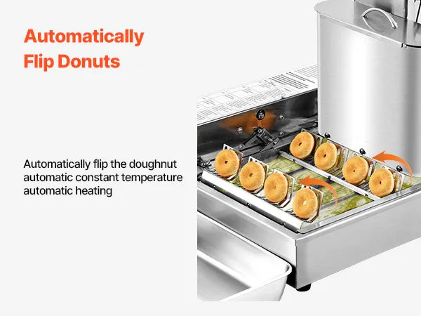 W pełni automatyczna obsługa: Ta maszyna do pączków jest wyposażona w inteligentny panel sterowania, który pozwala Twojemu zespołowi bez wysiłku uzyskać równomierne pączki przy minimalnym wysiłku. Funkcja automatycznego obracania zapewnia powtarzalne rezultaty pieczenia. Wystarczy ustawić – a maszyna zajmie się resztą.