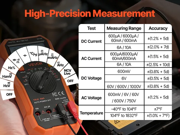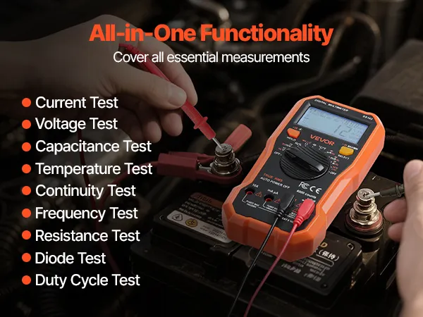 Wszechstronna funkcjonalność: multimetr VEVOR TRMS obsługuje testy napięcia stałego/przemiennego, prądu, rezystancji, pojemności, częstotliwości, temperatury, diody, ciągłości i współczynnika wypełnienia, zapewniając kompleksową funkcjonalność do samodzielnych i profesjonalnych pomiarów elektrycznych