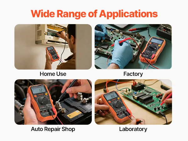 Ten profesjonalny multimetr cyfrowy nadaje się do rozwiązywania problemów z urządzeniami gospodarstwa domowego, testowania obwodów samochodowych, precyzyjnych pomiarów laboratoryjnych i wielu innych zastosowań. Z łatwością radzi sobie z szerokim zakresem napraw i zadań testowych.