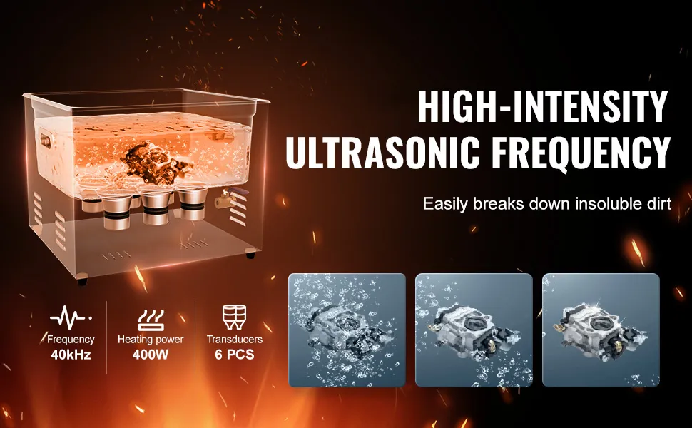Wydajne czyszczenie: Myjka ultradźwiękowa VEVOR pracuje z ultrawysoką częstotliwością 40 kHz, generując miliony maleńkich bąbelków, które eksplodują w wodzie i uwalniają silną energię czyszczącą. Energia ta przenika każdą szczelinę i usuwa nawet uporczywy brud z delikatnych powierzchni tak dokładnie, że żaden obszar nie pozostaje nieoczyszczony.