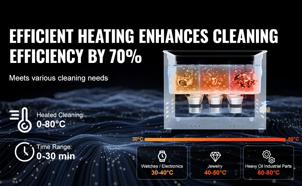 Czyszczenie termiczne: W przypadku różnych przedmiotów, takich jak biżuteria, zegarki/akcesoria elektroniczne i komponenty przemysłowe o dużej zawartości tłuszczu, można regulować temperaturę czyszczenia w zakresie od 0 do 80°C, aby przyspieszyć usuwanie zabrudzeń. Rezultatem jest bardziej wydajne i ukierunkowane czyszczenie. Tryb wysokiej temperatury szybko usuwa uporczywe zabrudzenia, natomiast tryb niskiej temperatury jest delikatniejszy dla delikatnych materiałów.