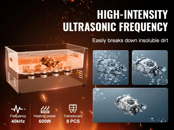 Wydajne czyszczenie: Myjka ultradźwiękowa VEVOR pracuje z ultrawysoką częstotliwością 40 kHz, generując miliony maleńkich bąbelków, które eksplodują w wodzie, uwalniając potężną energię czyszczącą. Energia ta przenika każdą szczelinę i dokładnie usuwa uporczywe plamy z delikatnych powierzchni, nie pozostawiając żadnego niedoczyszczonego miejsca.