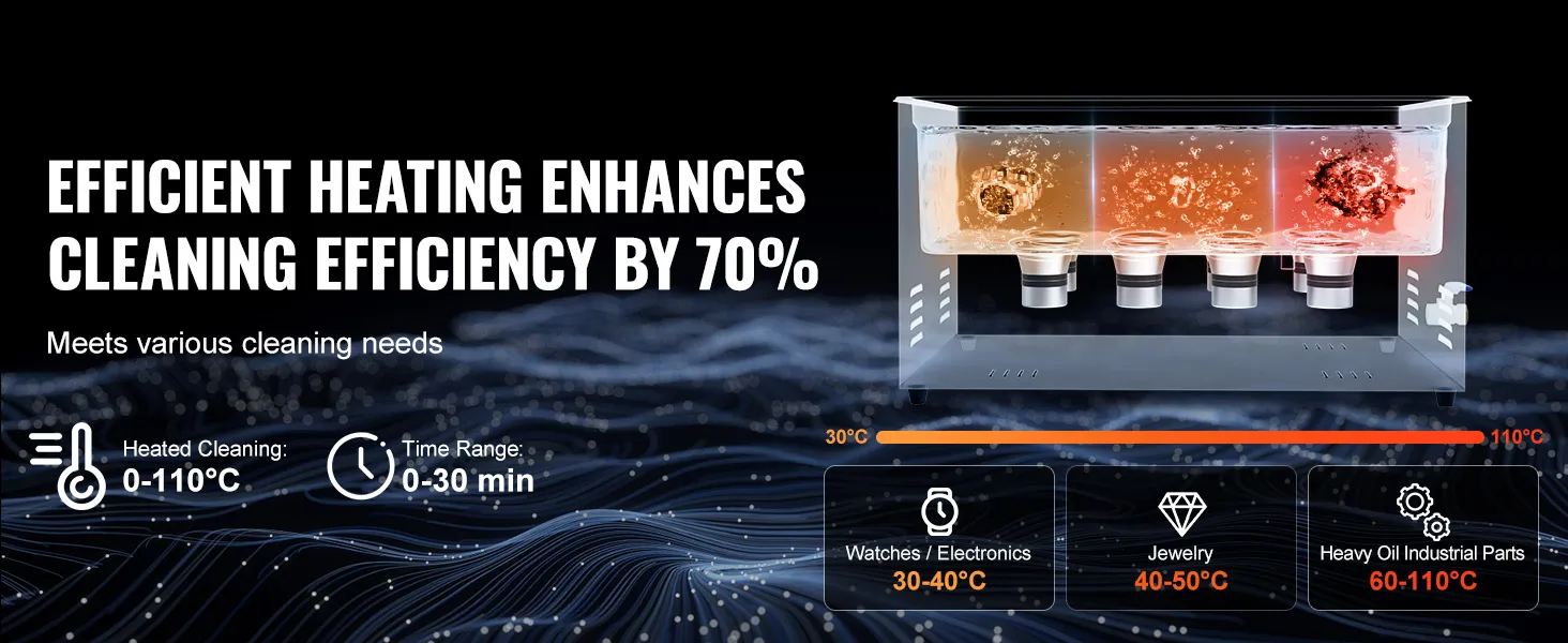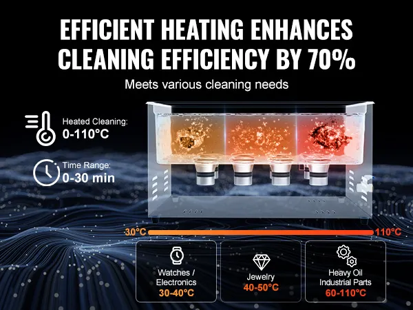 Czyszczenie na gorąco: W przypadku różnych przedmiotów, takich jak biżuteria, zegarki/akcesoria elektroniczne i tłuste elementy przemysłowe, można regulować temperaturę czyszczenia w zakresie 0-110°C, aby przyspieszyć rozpuszczanie brudu. Zapewnia to bardziej wydajne i precyzyjne rezultaty czyszczenia. Tryb wysokiej temperatury szybko rozpuszcza uporczywy tłuszcz, a tryb niskiej temperatury delikatnie chroni delikatne materiały.