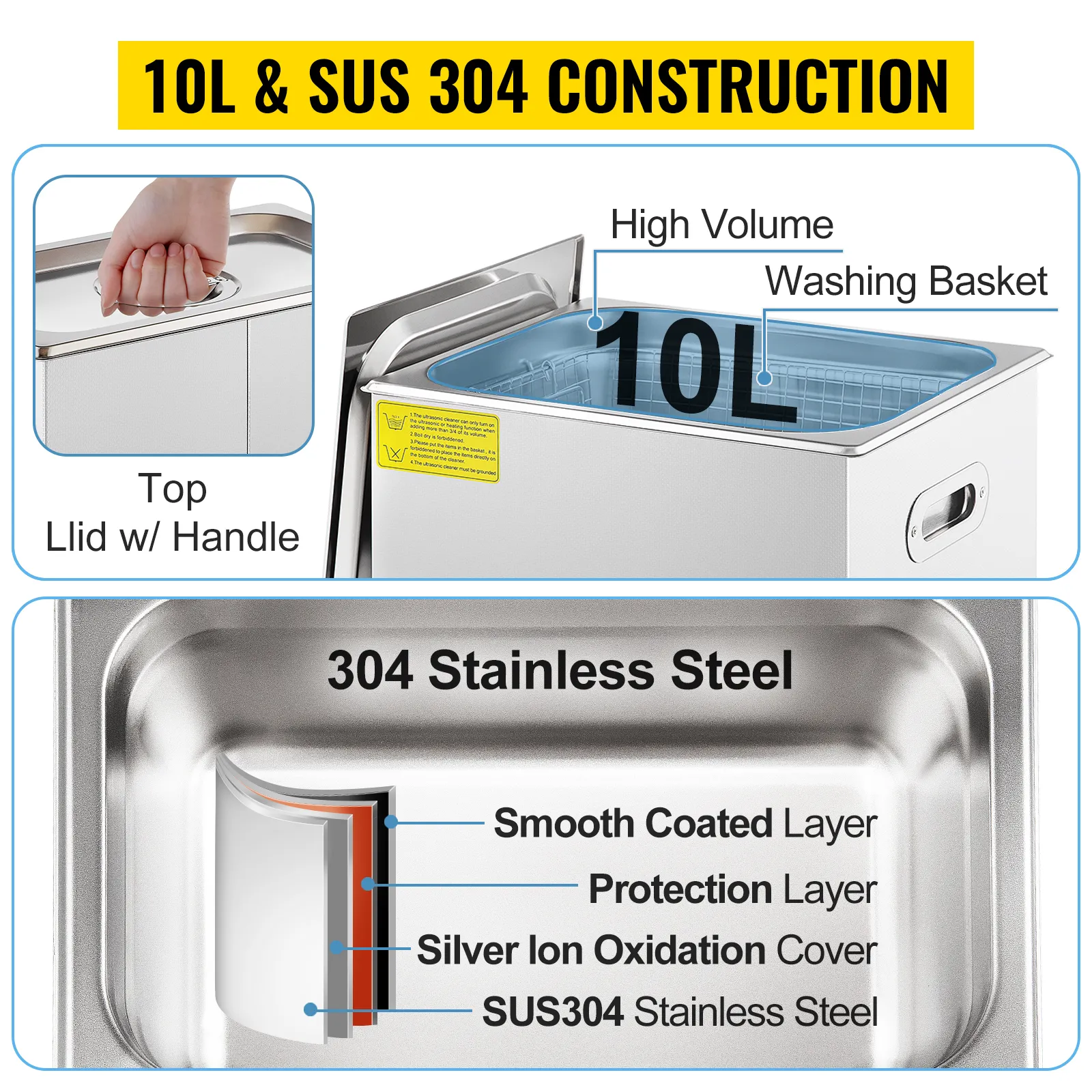 Wyposażona w antykorozyjną i antykorozyjną stal nierdzewną 304, ta myjka ultradźwiękowa została zaprojektowana tak, aby służyć latami. Duży pojemnik o pojemności 10 litrów zapewnia wystarczająco dużo miejsca na biżuterię, okulary, zegarki lub protezy zębowe. Zawiera pokrywę tłumiącą hałas i kosz do mycia przedmiotów wymagających mniejszego tarcia.