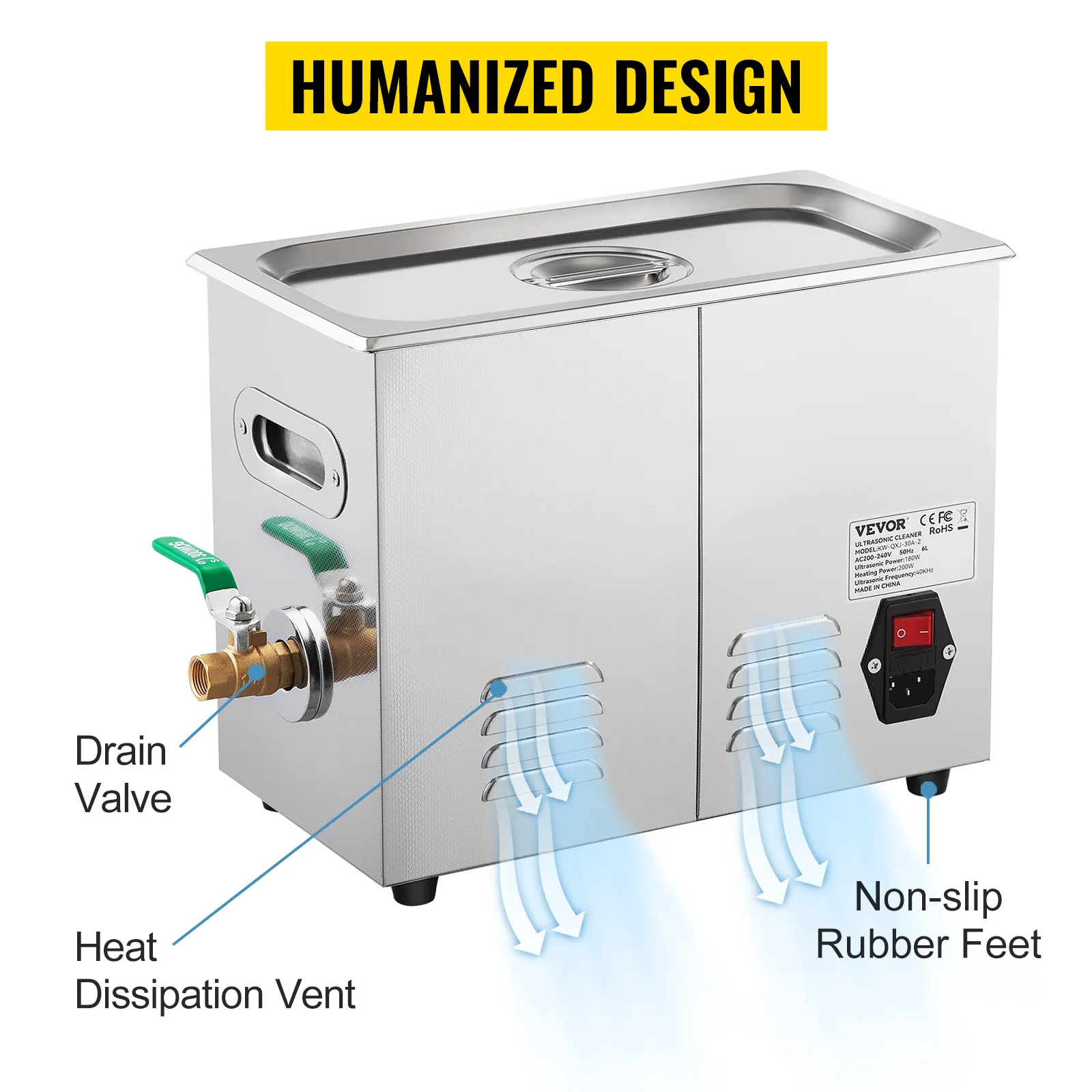 VEVOR przywiązuje dużą wagę do oferowania swoim klientom możliwie najlepszych doświadczeń podczas korzystania ze swoich produktów. Podczas projektowania produktu uwzględniono wiele przemyślanych szczegółów, takich jak otwory wentylacyjne odprowadzające ciepło, antypoślizgowe gumowe nóżki oraz zawór spustowy odprowadzający wodę, dzięki czemu można bezpiecznie i wygodnie korzystać z urządzenia.