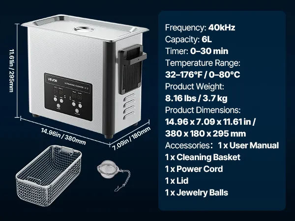 VEVOR 6 L Myjka ultradźwiękowa, profesjonalna maszyna do czyszczenia ultradźwiękowego z koszem czyszczącym i wyświetlaczem cyfrowym, 120 W, stal nierdzewna, 40 kHz, przemysłowa maszyna do czyszczenia zegarków i biżuterii