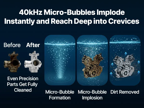 Skuteczne czyszczenie: fale ultradźwiękowe o częstotliwości 40 kHz generują 40 000 mikropęcherzyków na sekundę, które „pękają” jak tysiące maleńkich szczoteczek. Usuwają smar, brud i osady z kanałów gaźnika, końcówek aerografów, pasków zegarków, małych części i wielu innych.