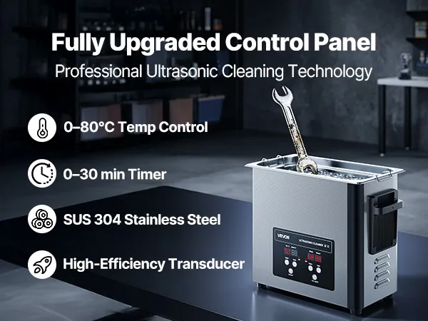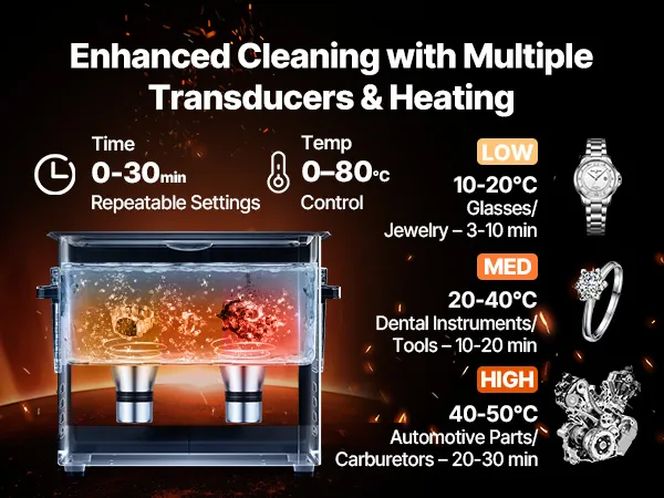 Nadaje się do wielu materiałów: Idealny do biżuterii, zegarków/elementów elektronicznych lub części przemysłowych z silnymi plamami oleju. Regulowana temperatura czyszczenia od 0 do 80°C przyspiesza usuwanie zabrudzeń i zapewnia bardziej wydajne i ukierunkowane czyszczenie.