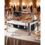 Zestaw do podgrzewania potraw VEVOR ze stali nierdzewnej z 2 patelniami o połówkowej wielkości (3,9 l), prostokątny dozownik ciepła z widoczną pokrywką, podstawką na patelnię z wodą i uchwytem na paliwo, na imprezy, srebrny