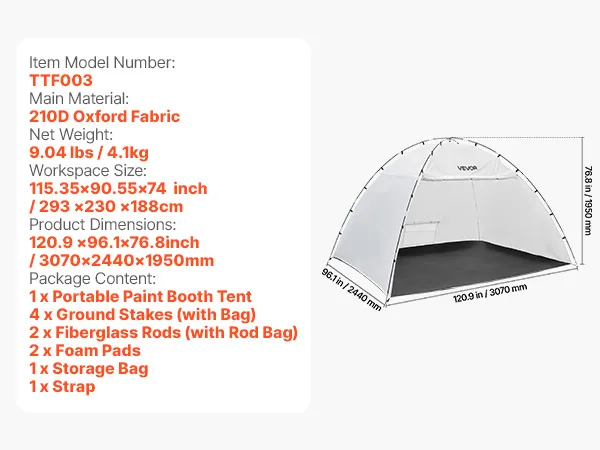 Ten przenośny namiot lakierniczy ma wymiary 293 x 230 x 188 cm (dł. x szer. x wys.) i oferuje miejsce na krzesła, stoły i szafki. Szybko składana rama z poliestru z torbą do przechowywania, solidne maszty z włókna szklanego, haki do mocowania na wietrze, śledzie do mocowania w podłożu, okna z siatki oraz zintegrowana podłoga zapewniają porządek w miejscu pracy.