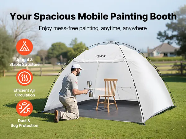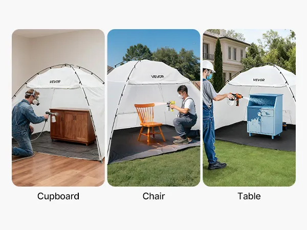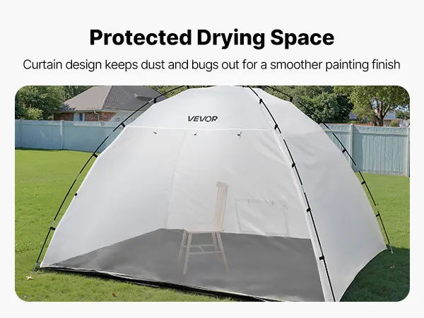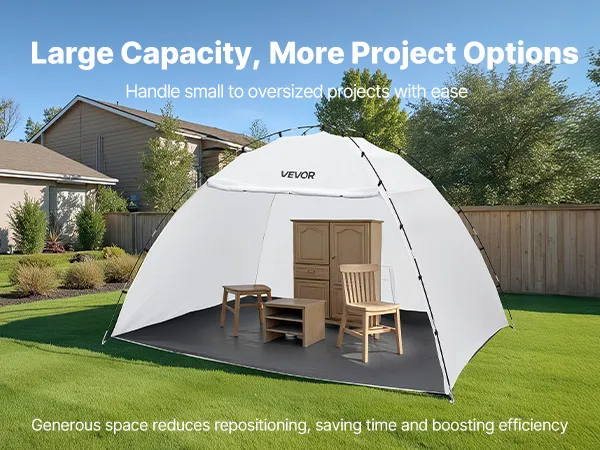 Łatwy montaż: Nasza kabina lakiernicza o dużej powierzchni roboczej o wymiarach 293 x 230 x 188 cm (115,35 x 90,55 x 74 cali) oferuje miejsce na krzesła, stoły i szafki. Szybki montaż i składana konstrukcja umożliwiają łatwą konfigurację i wygodne przechowywanie.