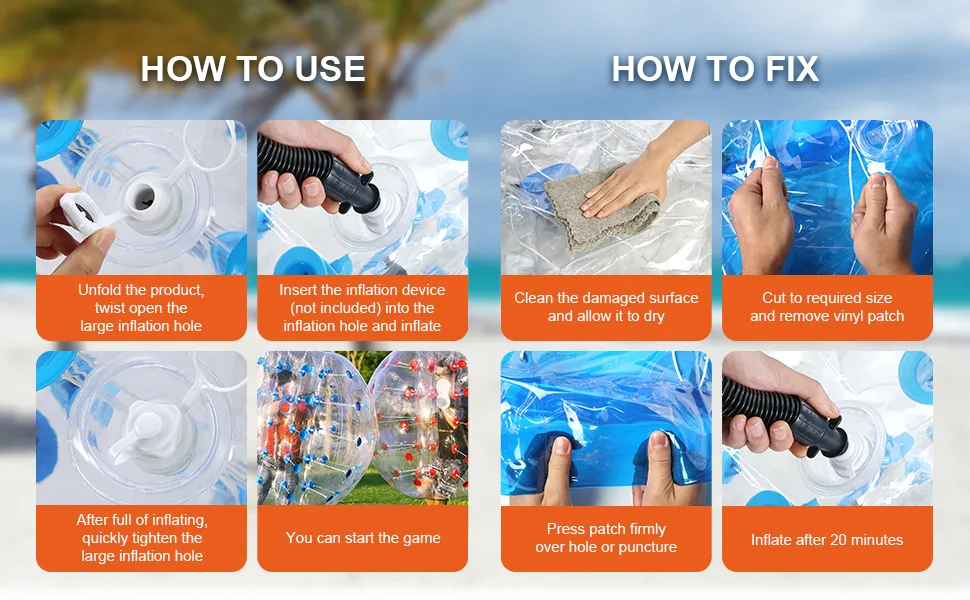 Jest idealna do różnych warunków na świeżym powietrzu. Na przykład do ogrodów, podwórek, placów zabaw i parków. Będzie idealna do wszelkiego rodzaju aktywności. Do czego służy ta piłka? Konstrukcja piłki sprawia, że jest wszechstronna i łatwa w użyciu. Możesz się nią cieszyć w każdym ośrodku rekreacyjnym lub na otwartej przestrzeni. Może być używana w wielu obszarach ośrodków rekreacyjnych. Sprawdza się zarówno u dzieci, jak i u dorosłych. Zalecamy używanie naszych nadmuchiwanych piłek na imprezach; nawet dzieci je pokochają. Mogą nas polubić zarówno dzieci, jak i dorośli. Zabawa i emocje powinny być dostępne przy każdej okazji. Nasza piłka nadaje się na rodzinne spotkania i imprezy. Niezależnie od tego, czy są to urodziny, czy też fajna aktywność na świeżym powietrzu, nadmuchiwana piłka zderzakowa zapewnia ekscytujący czas. Jej lekka konstrukcja umożliwia łatwy transport, zapewniając niekończącą się zabawę w różnych miejscach z pewnością siebie. Wszechstronność daje dar cennego dodatku do każdej aktywności na świeżym powietrzu.