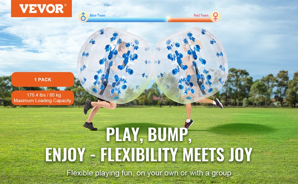 Nadmuchiwana piłka bumper VEVOR jest wyposażona w mocne paski na ramiona. Paski te zapewniają, że piłka pewnie trzyma się ciała. Zwiększają bezpieczeństwo i wygodę podczas gry. Możesz się swobodnie poruszać, nie martwiąc się o to, że piłki się ześlizgną. Zaprojektowaliśmy paski tak, aby wytrzymywały siłę uderzeń i wstrząsów. Utrzymują piłkę mocno na miejscu, dzięki czemu możesz skupić się na zabawie. Ta dodatkowa funkcja sprawia, że nadmuchiwana bomba zderzakowa jest jeszcze przyjemniejsza.