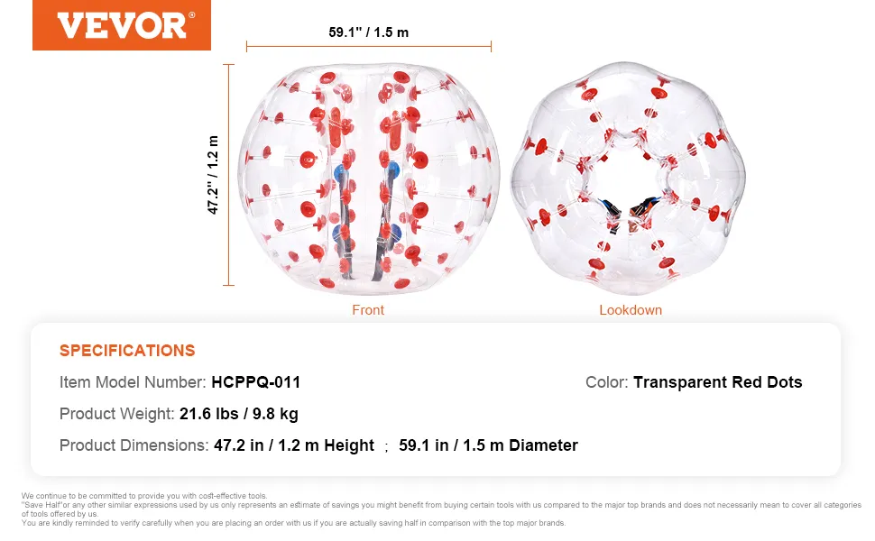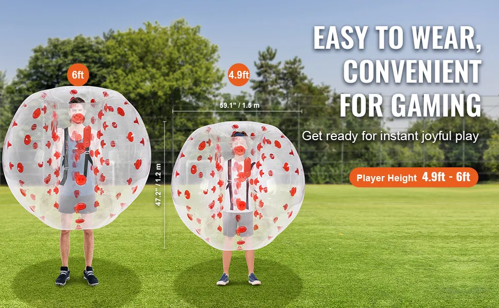 Nadmuchiwana piłka bumper VEVOR jest przestronna i wygodna. Ma średnicę 5 stóp. Dzięki temu idealnie nadaje się dla nastolatków i dorosłych. Jej rozmiar zapewnia, że każdy wygodnie się w niej zmieści. Pomimo swoich rozmiarów, piłka jest łatwa do przenoszenia i nie jest zbyt ciężka. Rozmiar piłki jest idealny do różnych aktywności na świeżym powietrzu. Można się nią bawić na dużych obszarach, takich jak woda, śnieg itp. Jest również wystarczająco przestronna, aby oddać się swobodnym turlaniom. To przyjemna zabawka. Nadaje się zarówno do aktywnych, jak i relaksujących aktywności na świeżym powietrzu. Mamy rozmiary, więc możesz mieć pewność, że każdy może wziąć udział w zabawie, o ile tylko wyciągniesz swoje jaja.