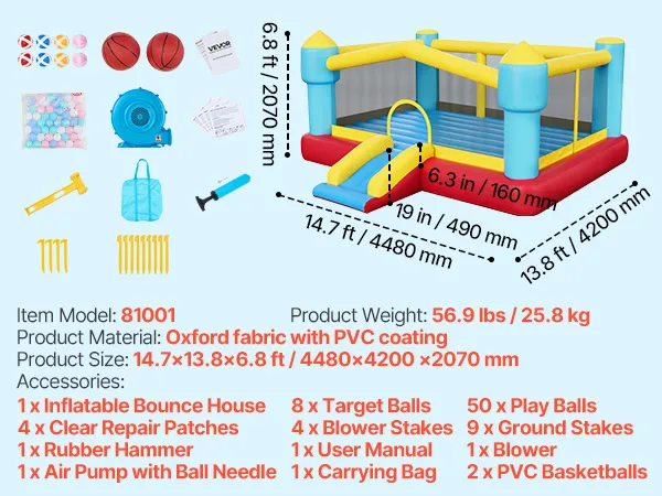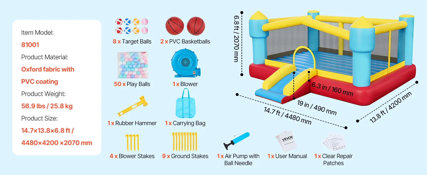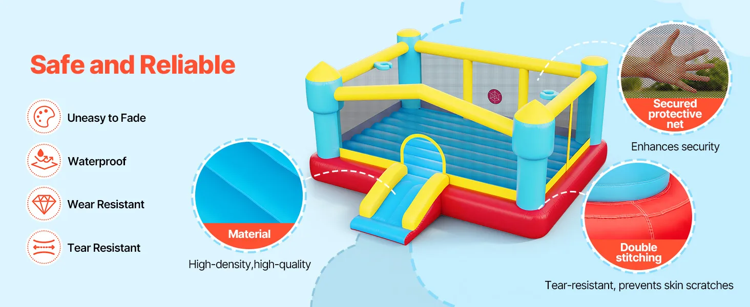 Nasz dmuchany zamek dmuchany wyposażony jest w szeroką zjeżdżalnię, strefę do skakania i kosz do koszykówki, który rośnie wraz z kreatywnością Twojego dziecka. Wykonany z wytrzymałej tkaniny Oxford 840D i 420D ze wzmocnionymi szwami, w zestawie znajduje się torba do przechowywania i otaczająca ją siateczka.
