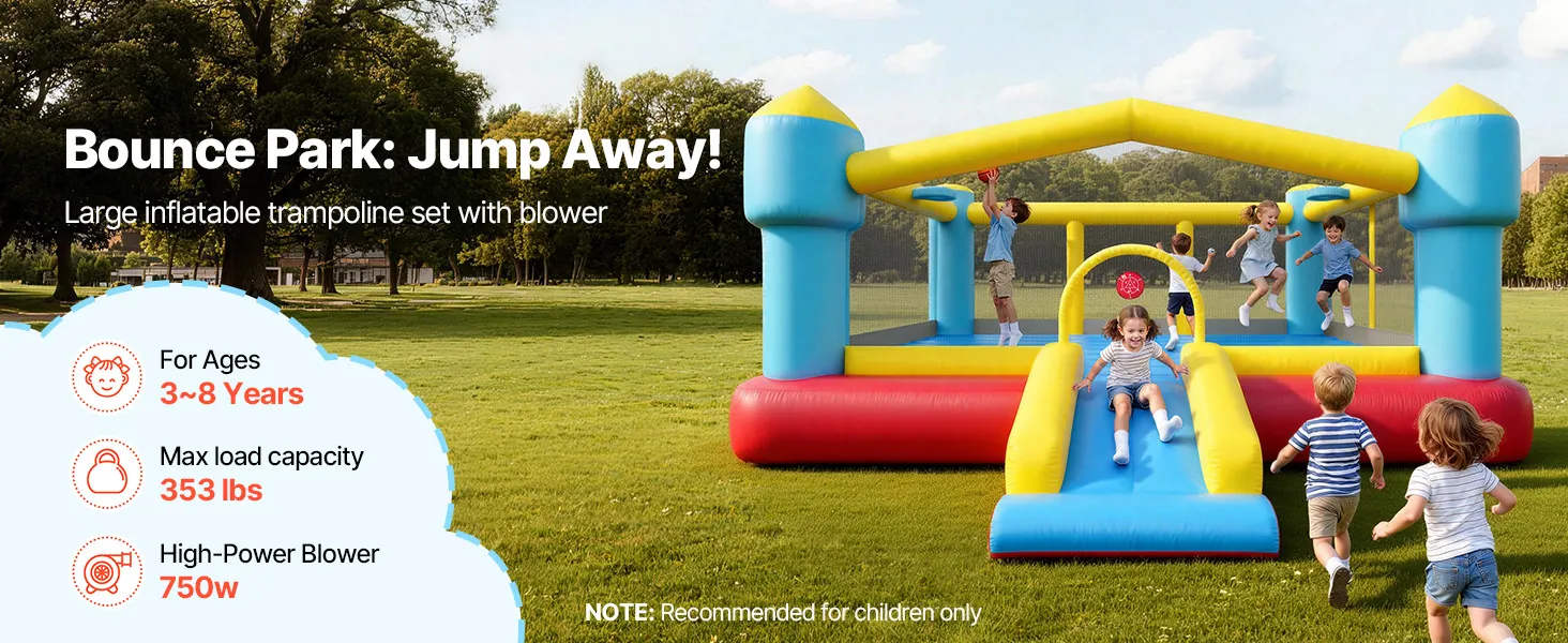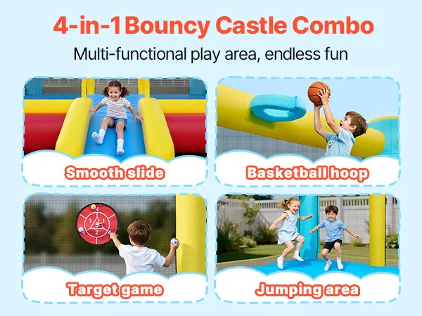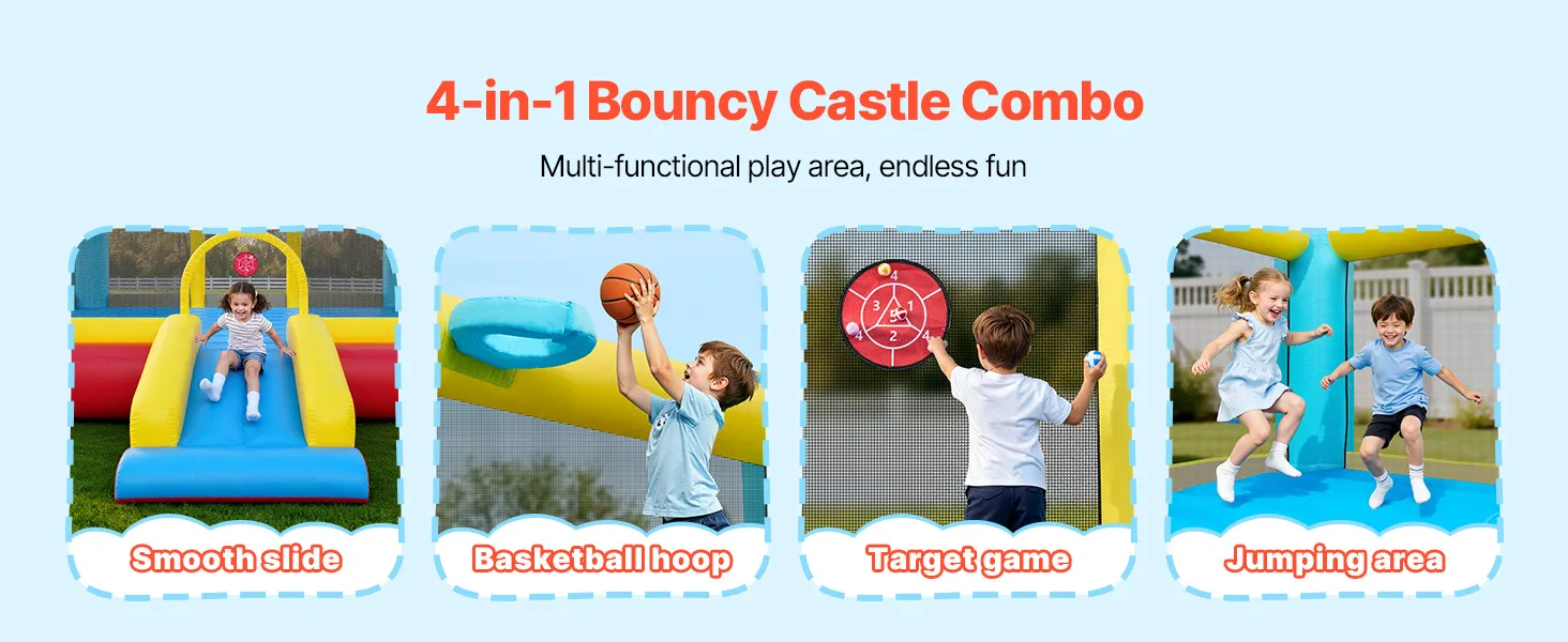 VEVOR Dmuchany zamek dmuchany (448 x 420 x 207 cm) dla dzieci ze zjeżdżalnią, koszem do koszykówki, grą w tarcze i miejscem do skakania, odpowiedni dla 3-4 dzieci (w wieku 3-8 lat) Impreza na świeżym powietrzu i w pomieszczeniach
