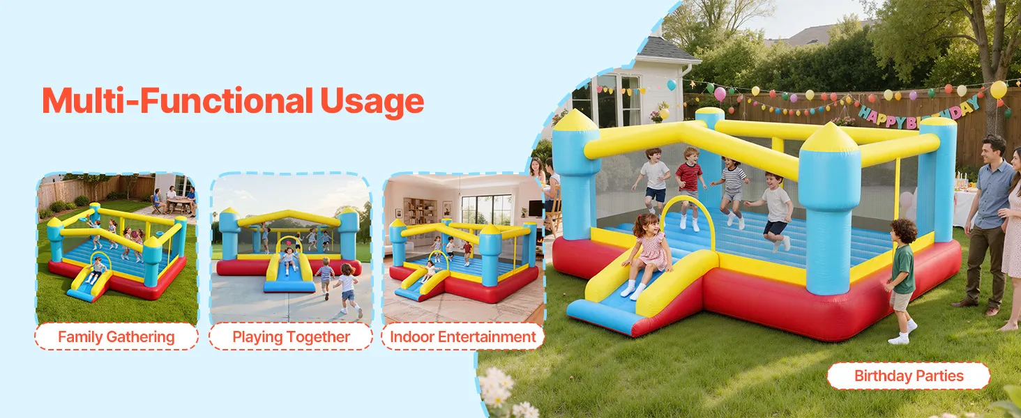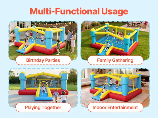 Dzięki wyjątkowemu designowi, ten dmuchany zamek idealnie sprawdzi się na przyjęciach urodzinowych, uroczystościach rodzinnych, świętach i letnich przyjęciach ogrodowych. Oferuje nieprzerwane skakanie, zjeżdżanie i kreatywną zabawę, gwarantując dzieciom aktywną zabawę i niezapomniane chwile z przyjaciółmi i rodziną.