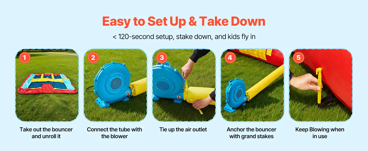 Ten dmuchany zamek jest łatwy w montażu i demontażu, a nadmuchanie go zajmuje mniej niż dwie minuty. Przed użyciem należy sprawdzić podłoże pod kątem ostrych przedmiotów. Aby schować, wyłącz dmuchawę, zwiń dmuchany zamek i umieść go w dołączonej torbie.