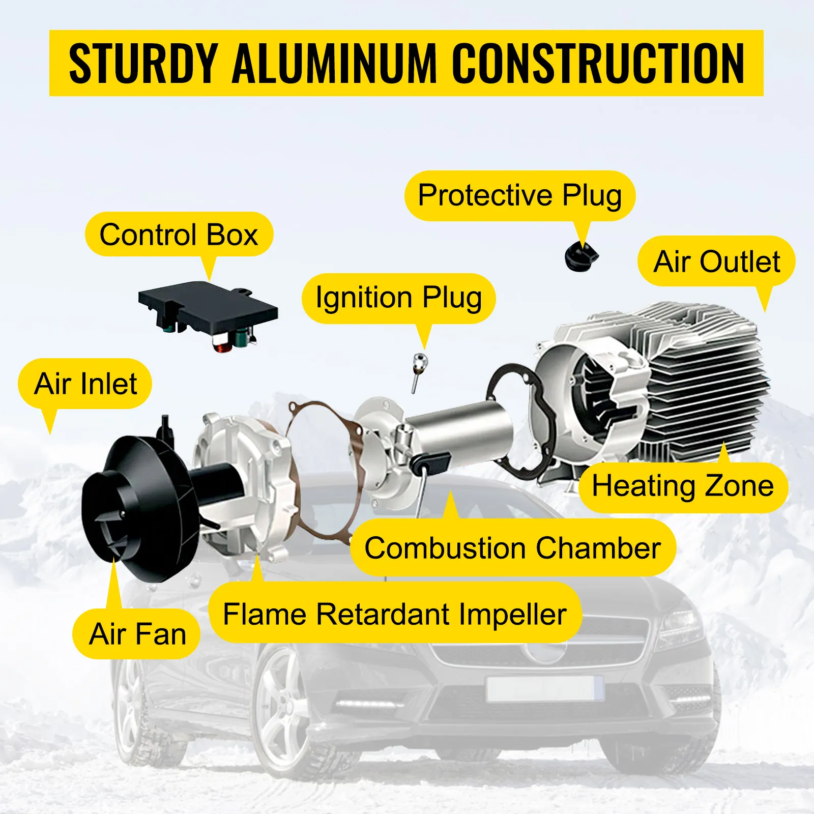Komora spalania, podstawa i skala odprowadzająca ciepło wykonane są z piaskowanych części aluminiowych. Ta dodatkowa nagrzewnica na olej napędowy ma integralną konstrukcję i charakteryzuje się równomierną mocą grzewczą i odpornością na wysoką temperaturę.