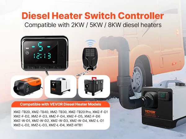 Kompletny zestaw sterowania ogrzewaniem postojowym: Ten zestaw sterowania ogrzewaniem postojowym zawiera jeden wyświetlacz LCD i jeden pilot zdalnego sterowania, stanowiąc niezawodny zamiennik, kompatybilny z większością ogrzewaczy diesla o mocy 2 kW, 5 kW i 8 kW. Obsługuje modele VEVOR: XMZ-TB20, XMZ-TB40, XMZ-TB30, XMZ-TB20 Pro, XMZ-FD, XMZ-WD, XMZ-LD i XMZ-HTB1.