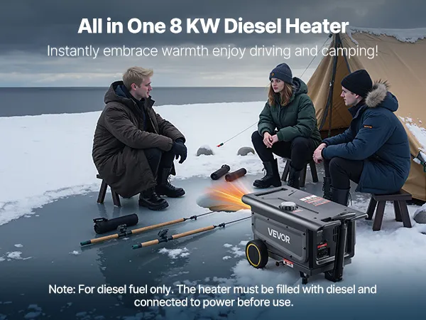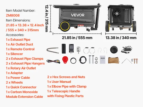 Szybkie nagrzewanie: Nasz nagrzewnica diesla o mocy 8 kW ogrzewa pomieszczenia o powierzchni 20–25 m² do temperatury 100°C w 5 minut i zapewnia komfortowy klimat wnętrza pojazdu w 10 minut. Działa z gniazdka 12 V/24 V lub 220 V. Teleskopowy uchwyt ułatwia przenoszenie.